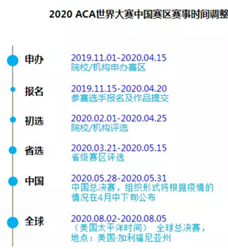 根据ACA大赛官网3月9日发出的“2020 ACA世界大赛中国赛区赛事时间调整”的通知,自拍流出 第一届ACA竞赛定于4月22日下午进行校赛评选,请各参赛学院通知本院学生务必在4月20日前将参赛作品提交至官网。