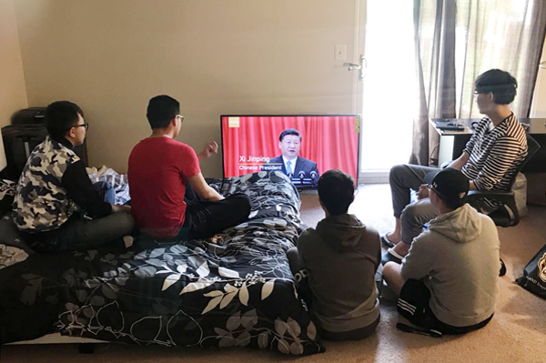 出国留学生与外国学生一同收看了大会实况。