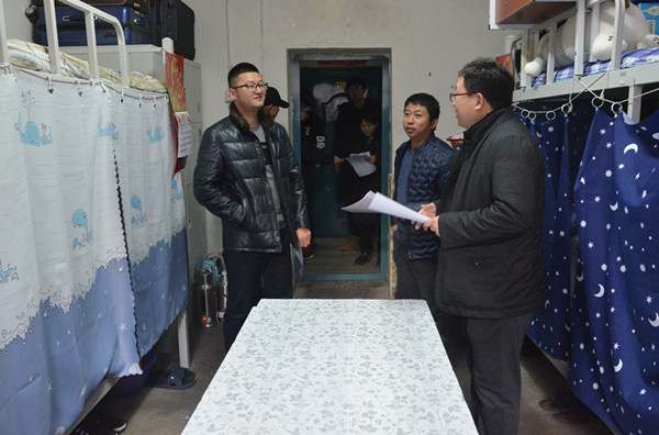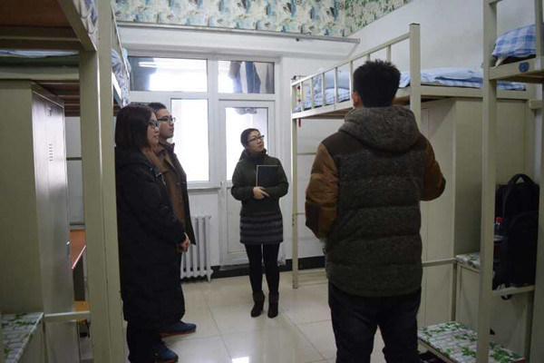 辅导员房玉琦、李守瑶、学生支部书记李强协同团委书记于伟,分别在南北两湖对学生宿舍进行了安全防火排查。检查内容包括宿舍卫生情况与用水用电等安全问题。