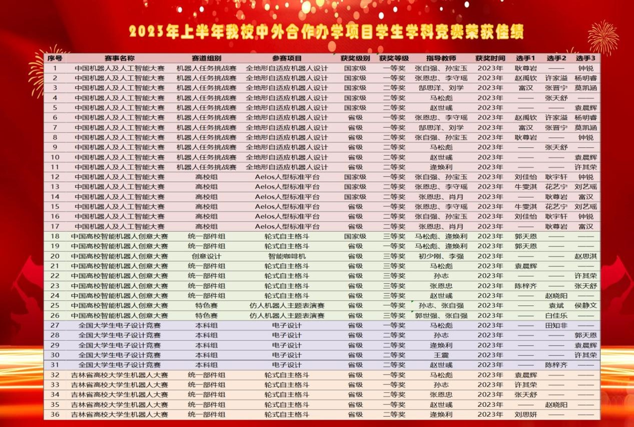 学生在指导老师的专业指导下,凭借扎实的专业基础、卓越的实践能力和团队协作精神在《中国机器人及人工智能大赛》、《中国高校智能机器人创意大赛》、《全国大学生电子设计竞赛》、《吉林省高校大学生机器人大赛》等竞赛中获国家级一等奖3项、二等奖5项、三等奖1项、省级一等奖9项、二等奖12项、三等奖6项佳绩。